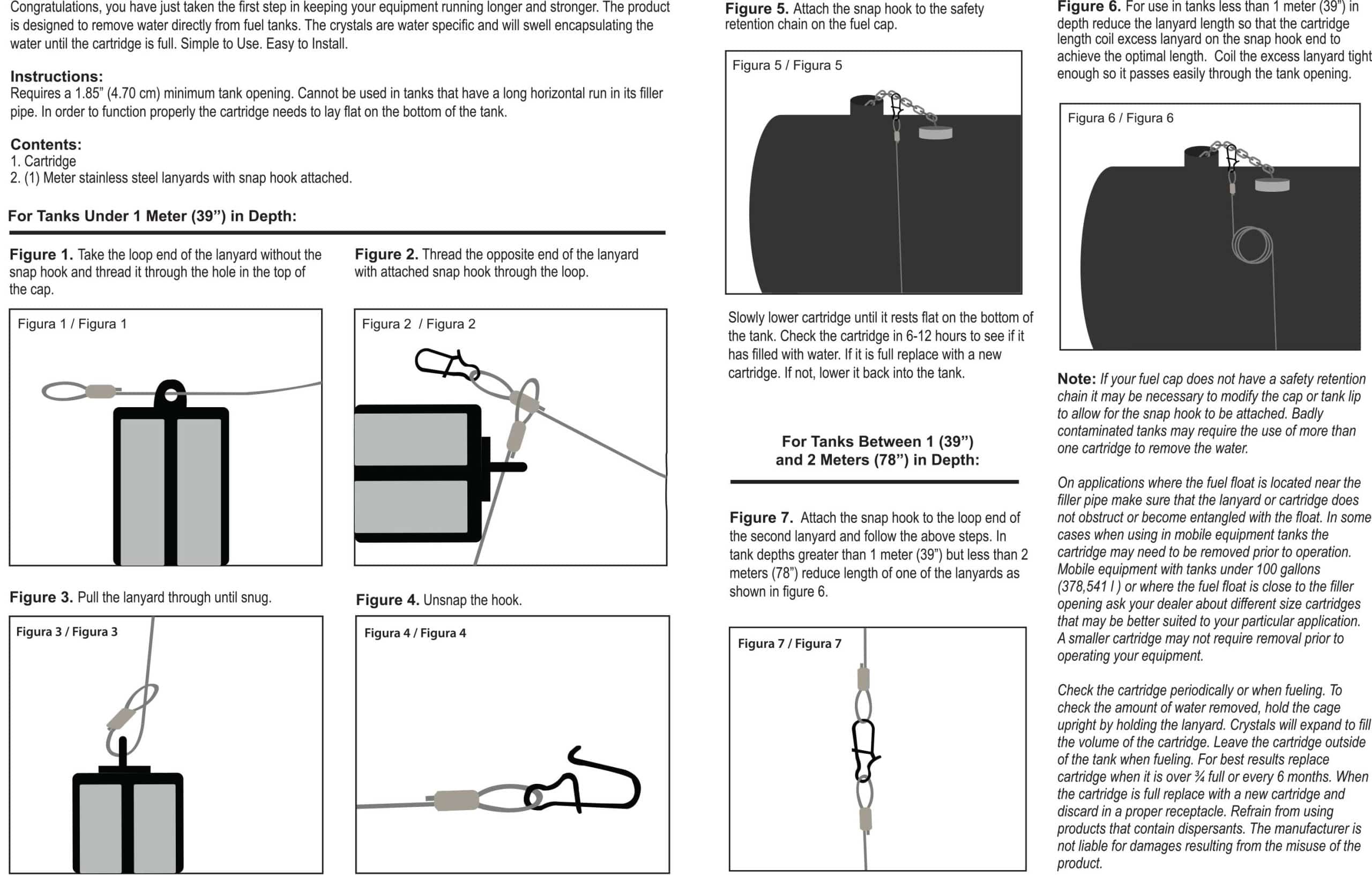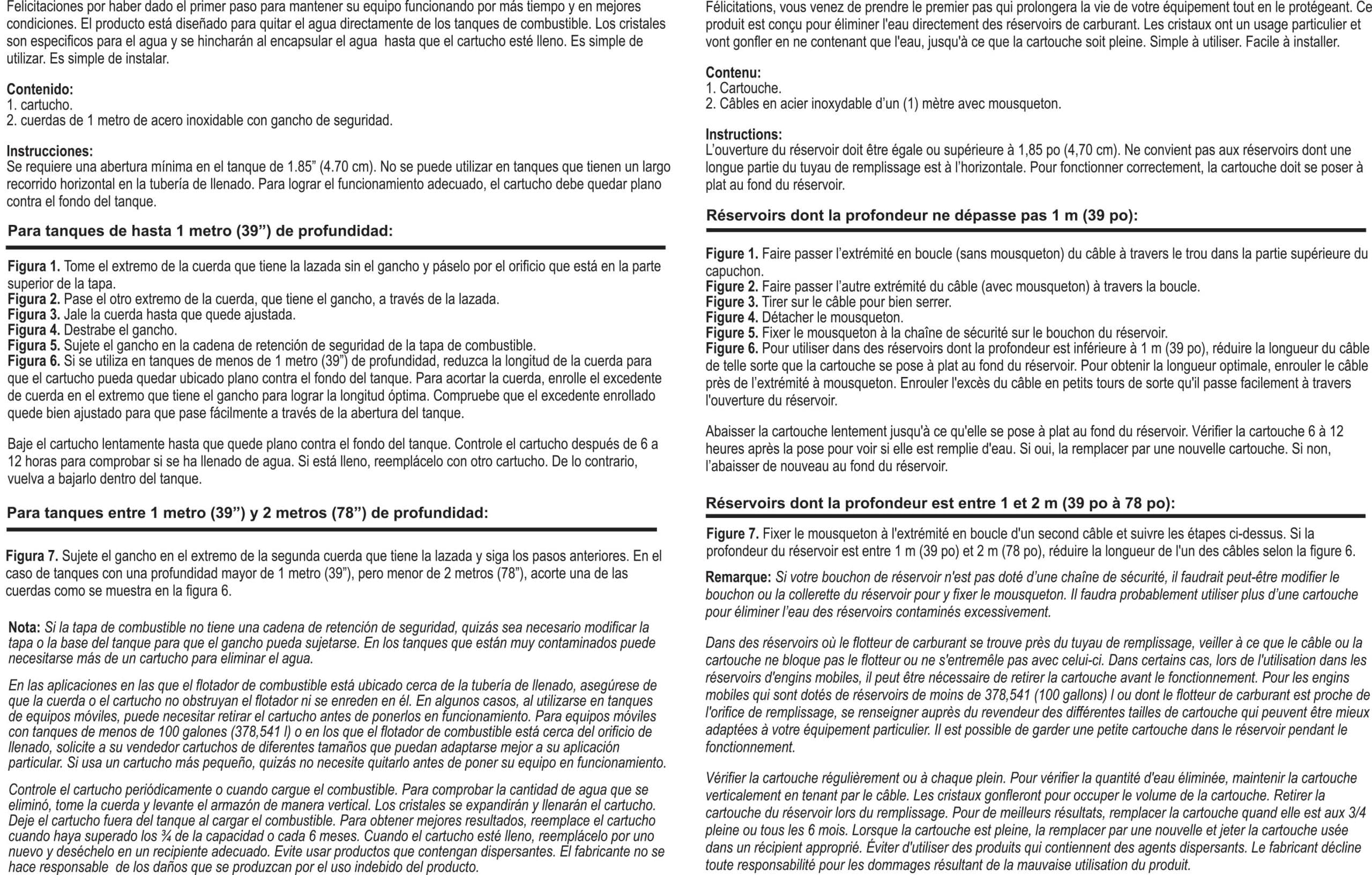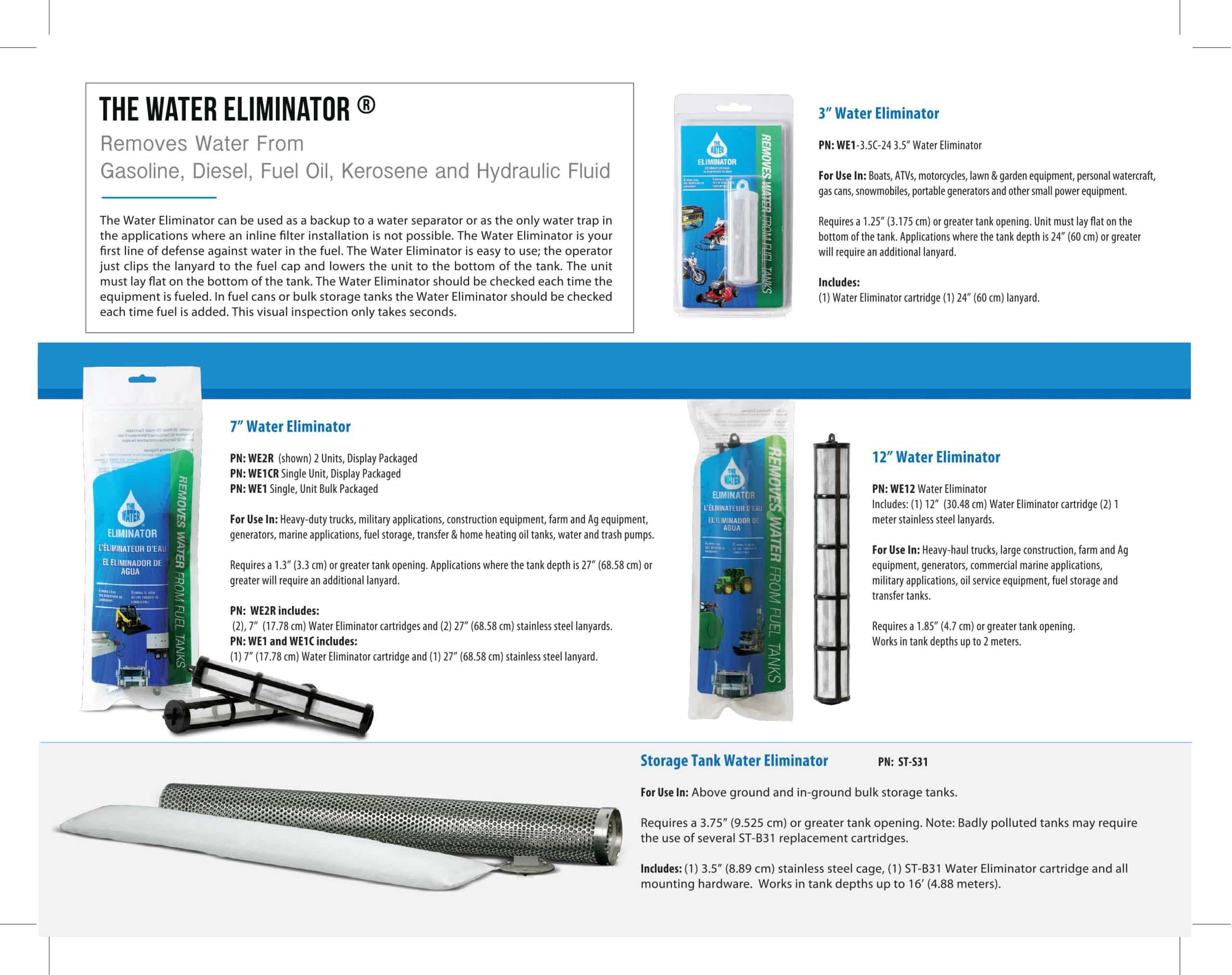 The Water Eliminator WE1 • WE1CR • WE2R are the same product only in different packaging. The cartridge is approximately 1.25 inches in width, 7.5 inches in length and includes a 27 inch lanyard with an attached snap-hook. The WE2R includes two Water Eliminator cartridges and two lanyards. The unit requires a 1.3 inch or greater tank opening and must lay flat on the bottom of the tank to properly function. Applications include: military, marine, heavy-duty trucks, home heating oil tanks, generators, farm, AG and construction equipment, fuel storage containers and transfer tanks, and medium sized power equipment.